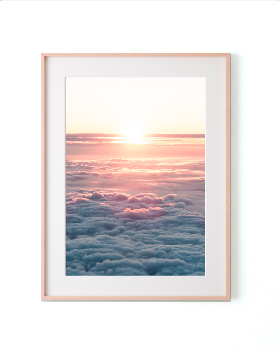 "Rise above the world with this ethereal shot taken from a mountain peak, where a sea of clouds stretches endlessly below. The sun casts a delicate pink glow across the misty expanse, creating a dreamlike tapestry of soft light and shadow. This premium print captures the serene beauty of dawn from the heights, offering a perspective that evokes a sense of wonder and the limitless majesty of nature."