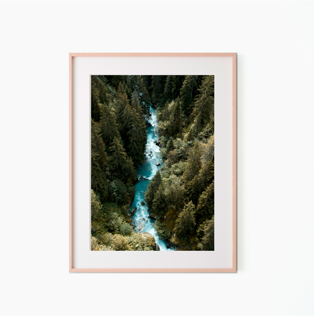 "Immerse yourself in the tranquil beauty of the Italian Alps with this captivating view of an alpine river winding through a dense pine forest. The crystal-clear water carves a sinuous path, its cool blue tones contrasting with the deep green canopy of the surrounding trees. This premium print captures the serene interplay of flowing water and untamed wilderness, offering a unique perspective that celebrates the raw beauty and harmony of nature."