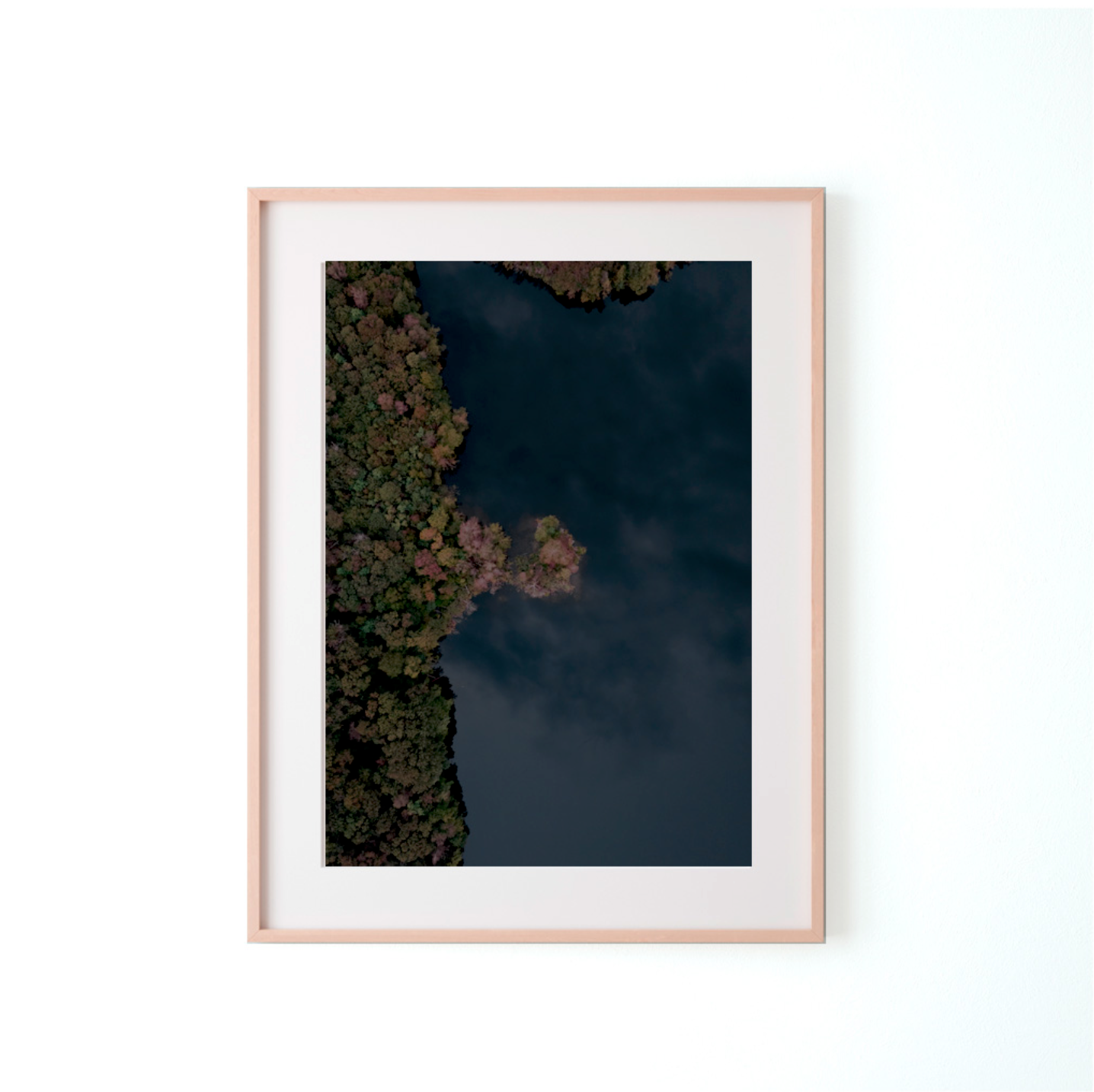 "Experience the mysterious allure of Montalto Lake, known as Black Lake, with this mesmerizing aerial shot. The dark, mirror-like waters of the lake create a striking contrast against the surrounding greenery, evoking a sense of tranquility and enigma. Nestled in a secluded landscape, this premium print captures the unique beauty of this hidden gem, offering a rare perspective that celebrates the captivating charm of nature's contrasts and serenity."
