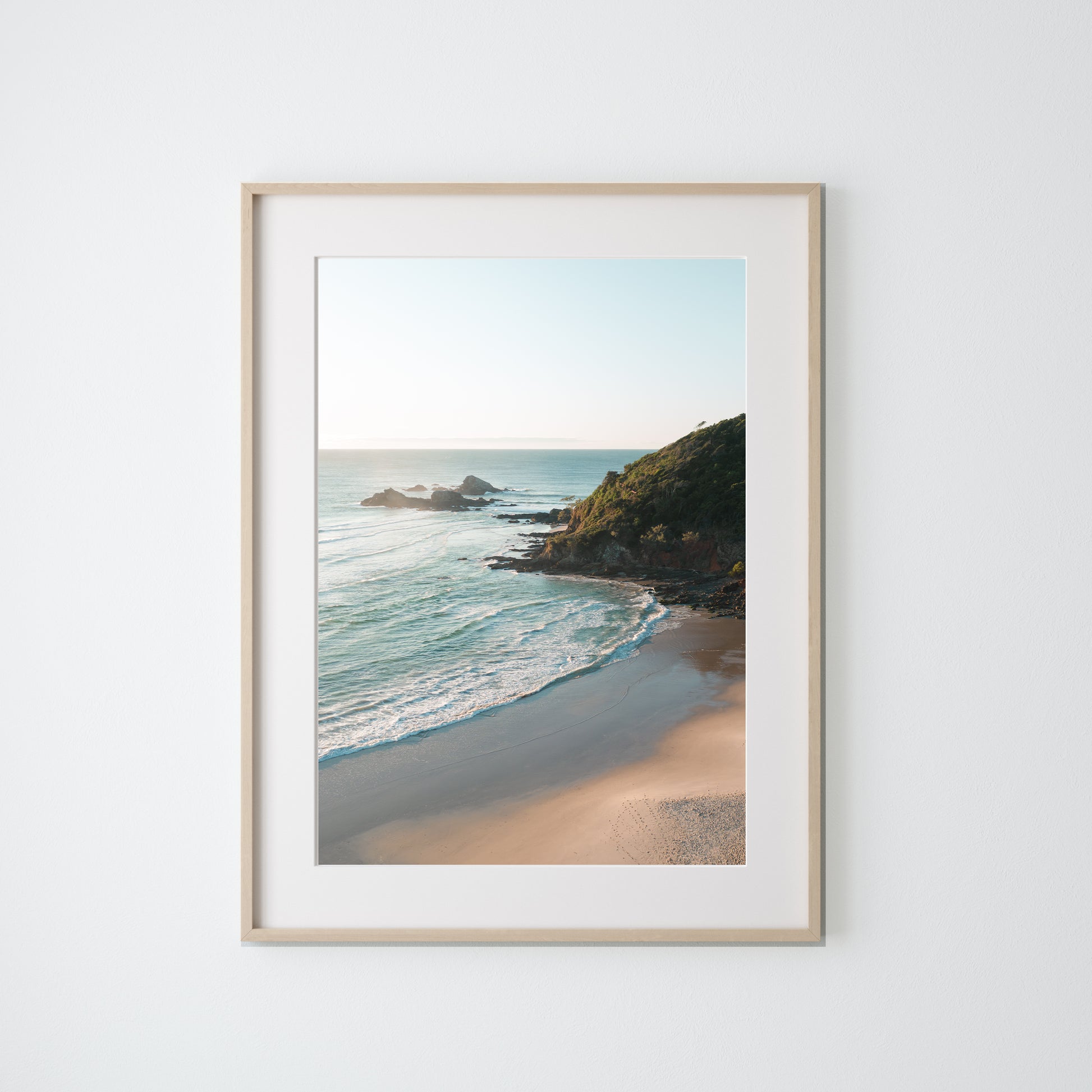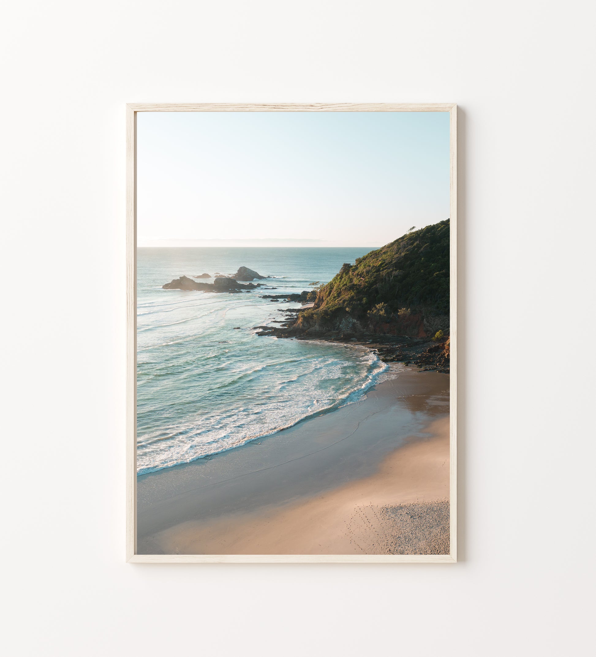 "Discover the iconic beauty of Broken Head through our premium drone photograph. From sandy beaches, the view ascends to rolling hills, climaxing with the majestic Three Sisters' silhouette. This aerial shot masterfully captures the serene dance between land and sea, showcasing nature's contrasting splendor in one frame."