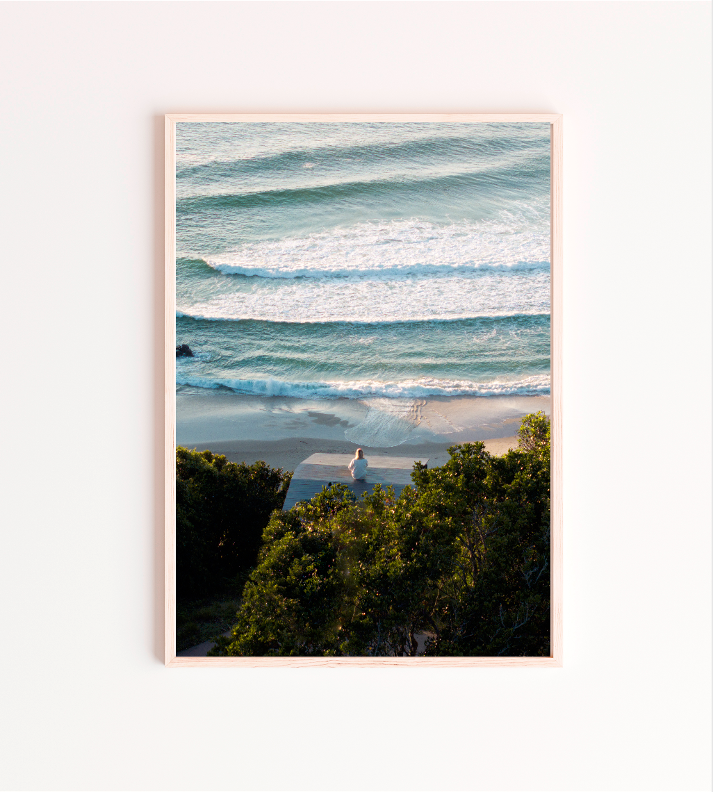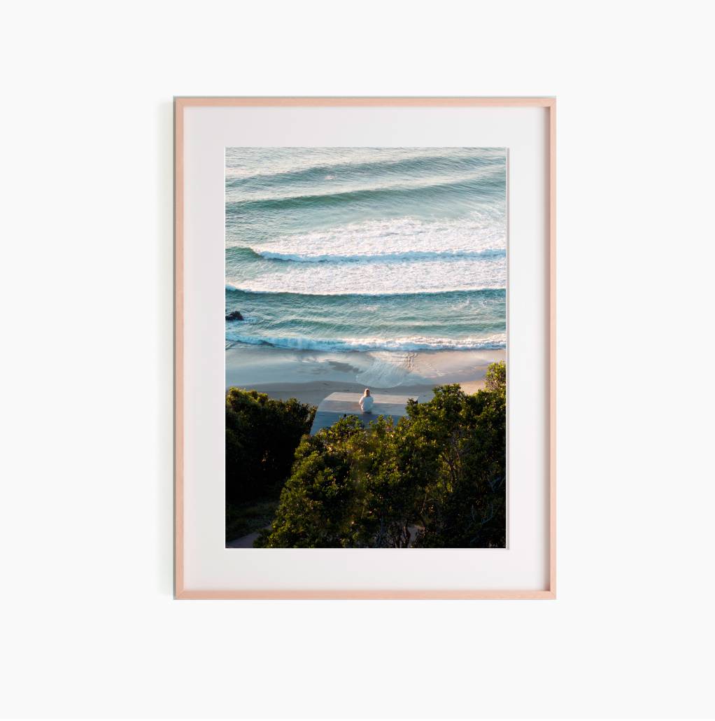 "Capture the essence of freedom and wonder with this breathtaking shot from the paraglide ramp in Byron Bay. A lone girl sits at the edge, gazing out over the sweeping coastal views, where the ocean meets the horizon in a tranquil embrace. Bathed in the soft hues of the golden hour, this image reflects a moment of quiet admiration and connection with nature's vast beauty. Perfect for those who cherish the spirit of adventure and the serenity of awe-inspiring landscapes, this premium print is a timeless celebration of perspective and possibility."