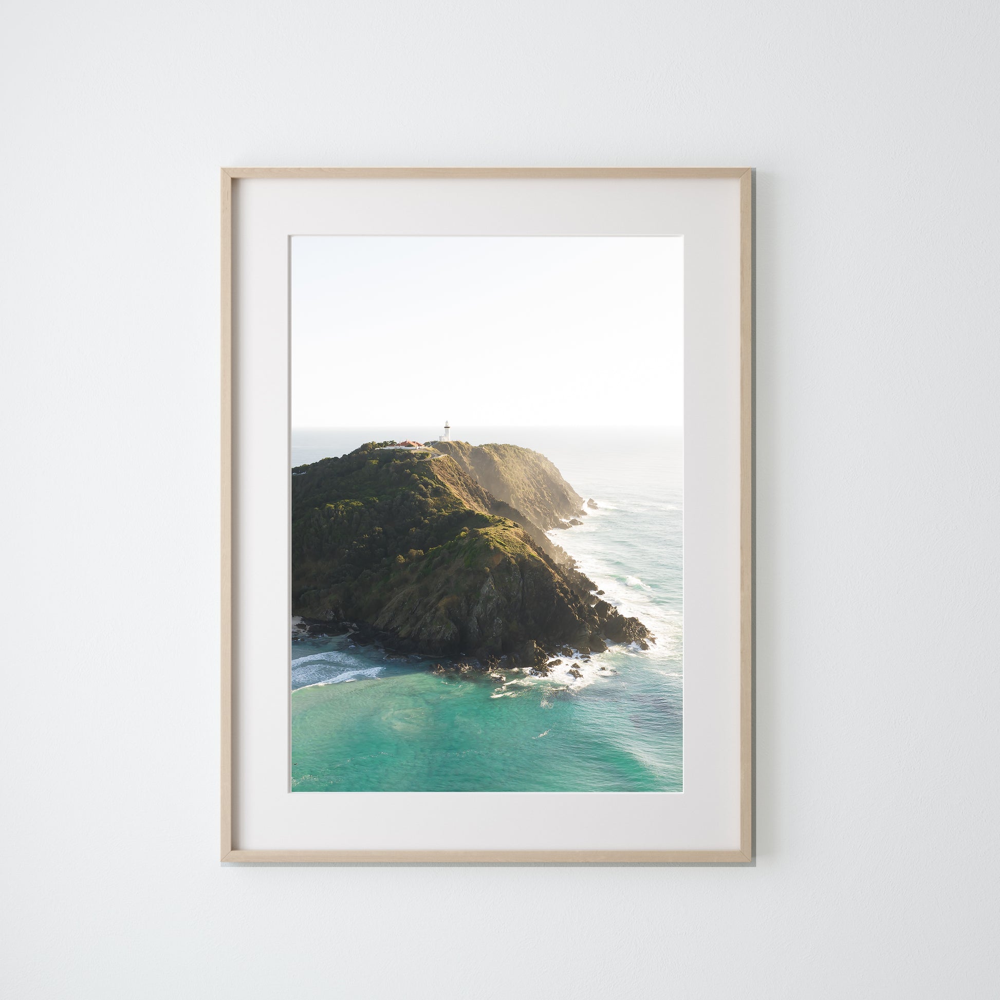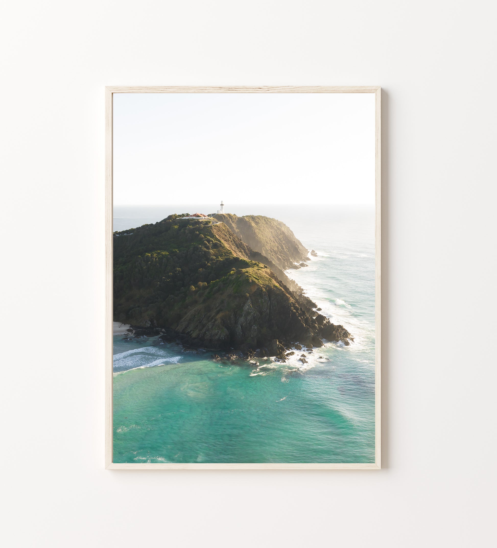 "In the early morning light, Cape Byron unveils its unparalleled beauty through a mesmerizing aerial view. The sun's golden touch highlights the distinctive coastline, embraced by azure waves. Standing tall, the Cape Byron Lighthouse, a regional emblem, is slightly veiled by a salty mist. The atmosphere, rich with the ocean's scent and the sun's warmth, paints a scene that's both ethereal and grounding. This drone photograph captures a timeless dance of land, sea, and sky, presented with premium precision."