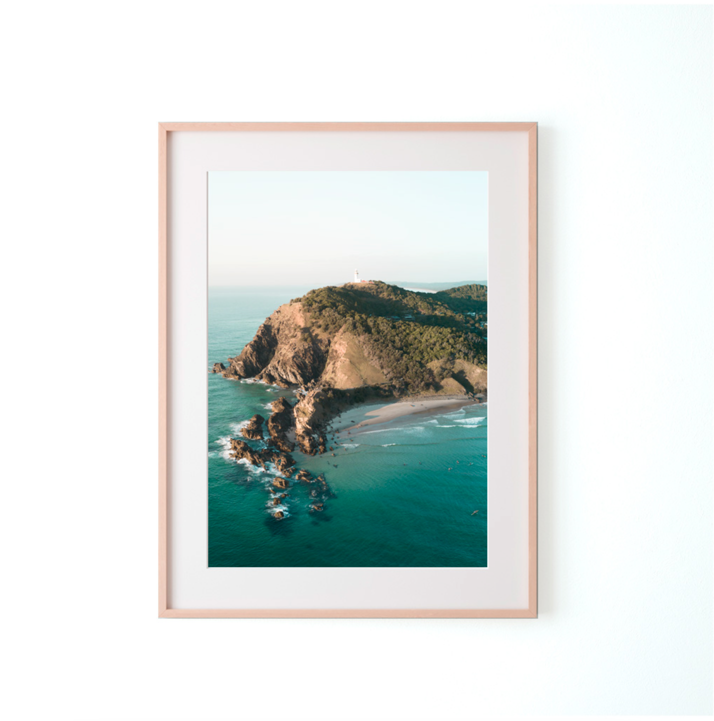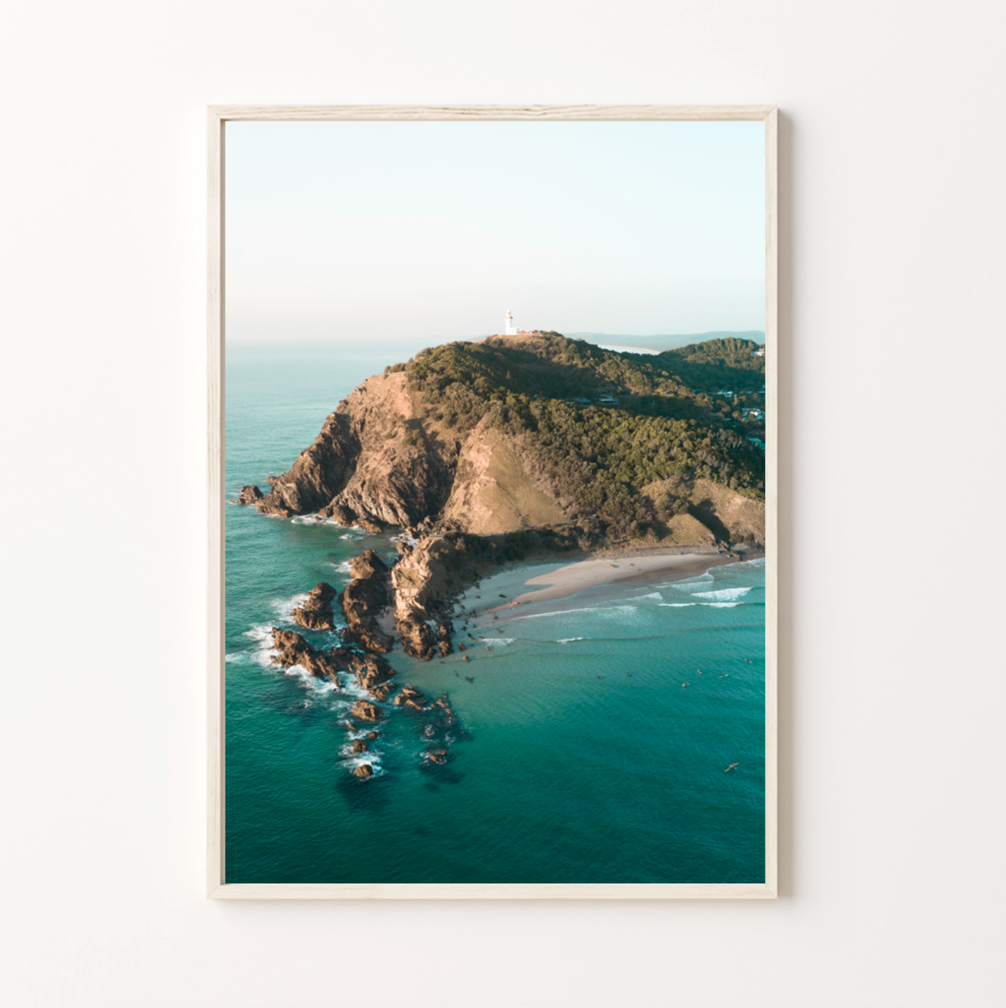 "A breathtaking view of Cape Byron as seen from Little Wategos Beach, showcasing the dramatic meeting of land and sea. The iconic lighthouse stands proudly atop the headland, framed by lush green cliffs that descend steeply into the turquoise waters below. The waves gently lap against the rocky shoreline, creating a dynamic contrast with the calm sands of Little Wategos in the foreground. The scene captures the serene beauty and grandeur of one of Byron Bay’s most picturesque vantage points."