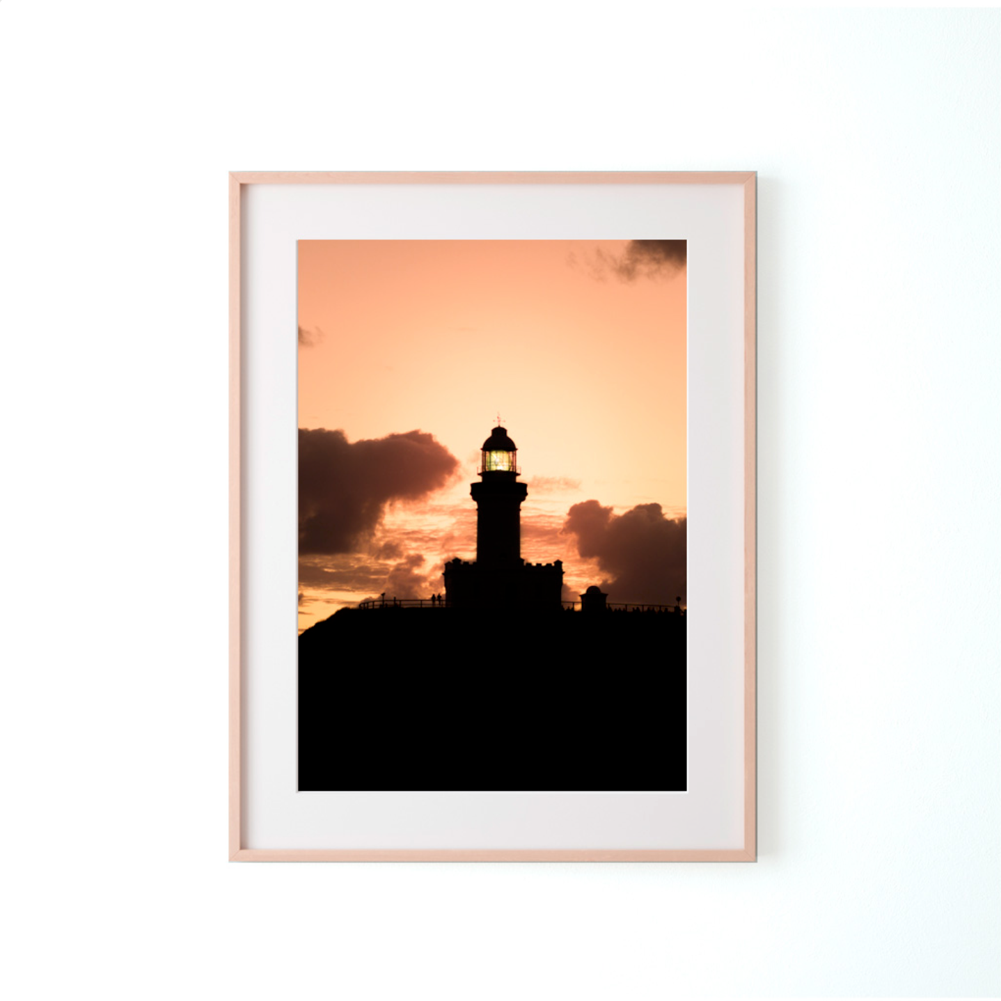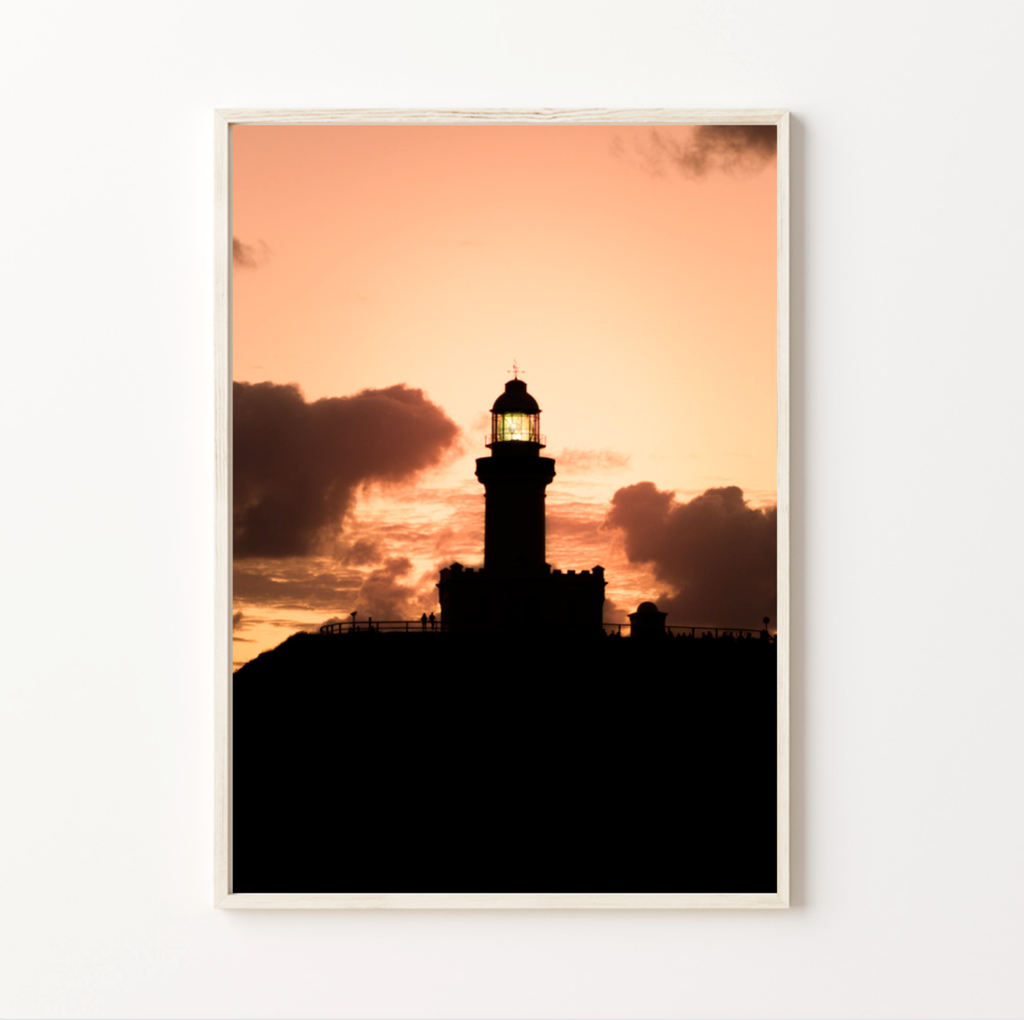 "A striking silhouette of the Byron Bay lighthouse stands tall against the vivid hues of a sunrise. The sky bursts into a symphony of fiery oranges, soft pinks, and deep purples, casting the iconic structure into shadowy relief. The gentle contours of the surrounding cliffs and the faint shimmer of the ocean below add depth to the scene. The lighthouse, a timeless beacon of the coast, is framed by the glowing horizon, capturing the serene and majestic beauty of dawn at Byron Bay."