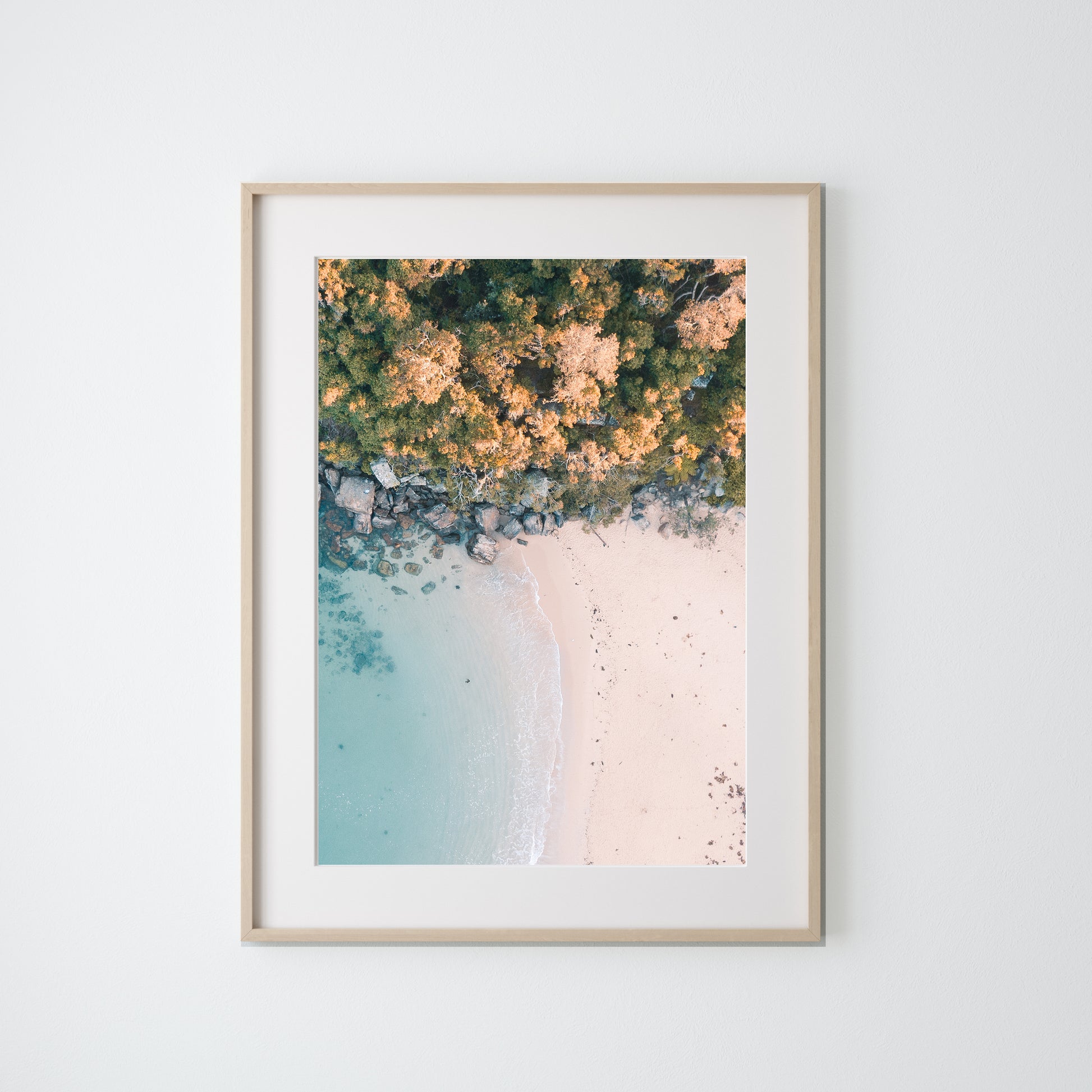 "From a bird's-eye view, the distinct landscapes of Shelly Beach unfold. Captured with premium precision by my drone, the gentle azure of the shallow waters contrasts with the pristine sands. Rugged rocks border the verdant forest beyond, showcasing the harmonious interplay of nature's varied elements."