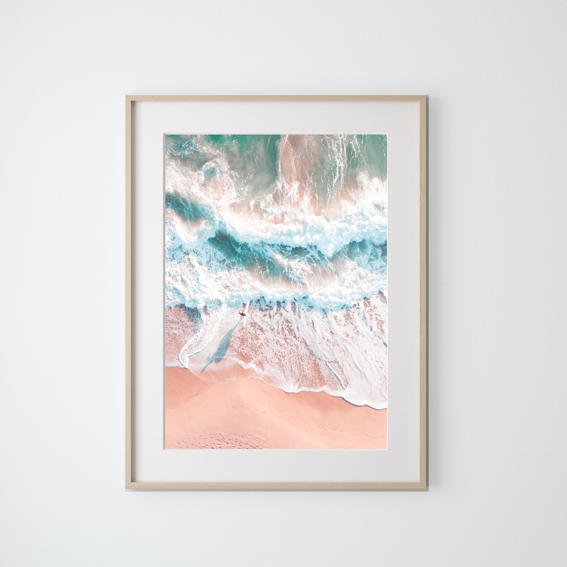 "From a drone's top-down view, a lone surfer strides towards the azure shoreline, with waves rhythmically crashing against the sand. Captured in premium detail, this image portrays a captivating moment of connection between man and the vast expanse of the ocean."