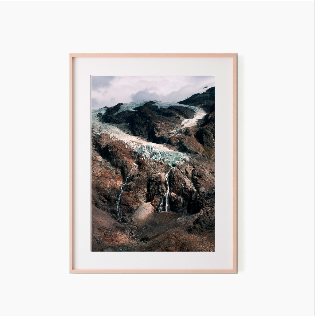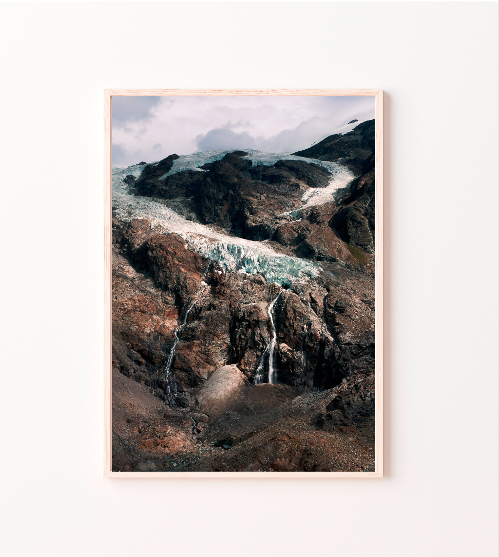 "Behold the dramatic beauty of the Lys Glacier as it cascades down the rugged slopes of Monte Rosa. This stunning view captures the glacier's immense power and grace, its icy expanse winding around the jagged rocks in a striking display of nature's artistry. The interplay of glistening ice and weathered stone creates a scene of raw, untamed grandeur. This premium print offers a breathtaking perspective of one of the Alps' most iconic glacial landscapes, perfect for those inspired by the majestic power of the mountains."