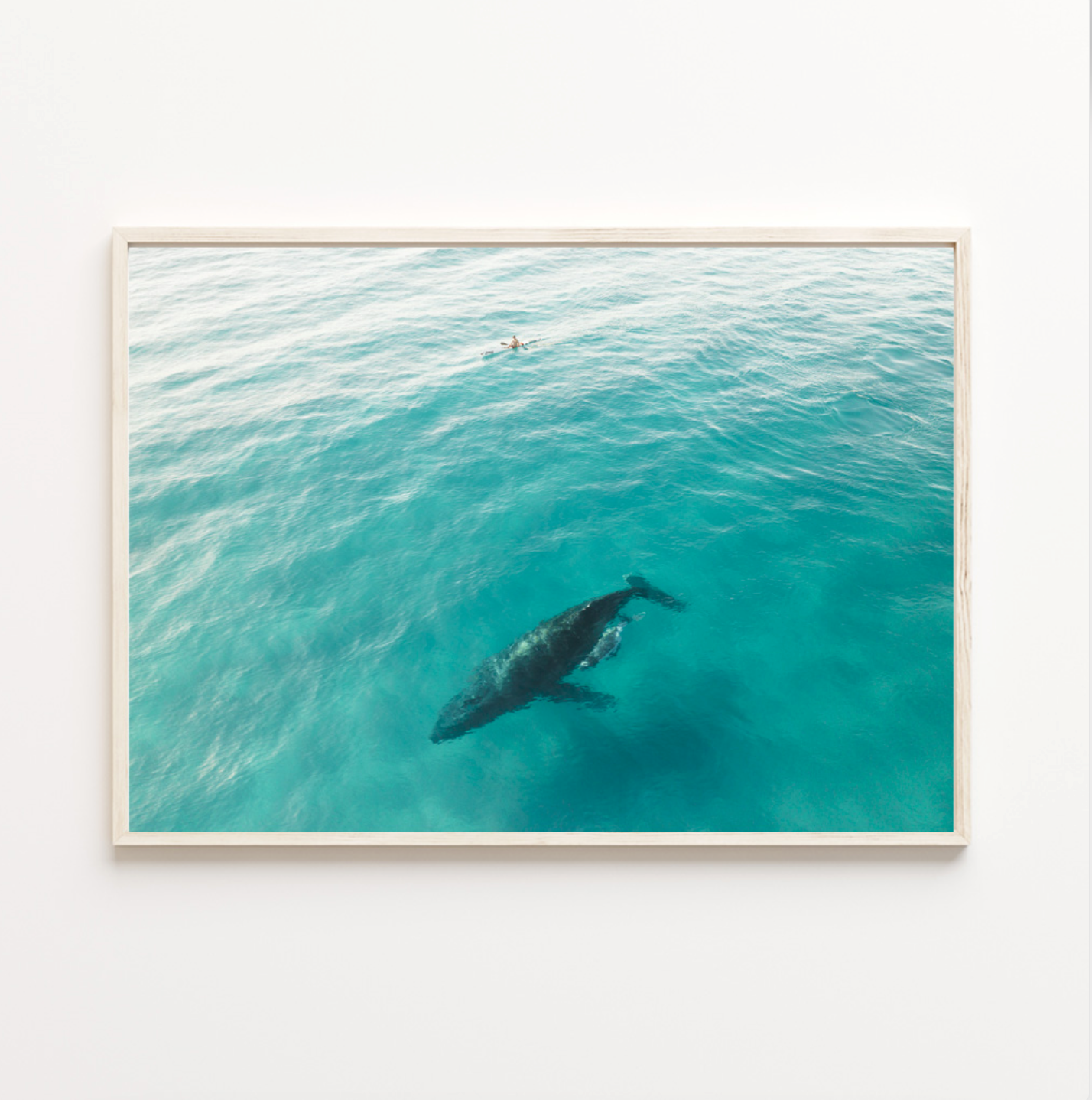 "A magical scene of a kayaker gliding gracefully across calm, turquoise waters alongside a massive whale. The kayaker’s bright craft is dwarfed by the majestic marine giant, whose sleek body breaks the surface in a show of serene companionship. Gentle ripples radiate from their movements, and the sunlight highlights the translucent water, offering a glimpse of the whale’s form beneath. This awe-inspiring moment captures the profound connection between humans and nature in the vastness of the ocean."