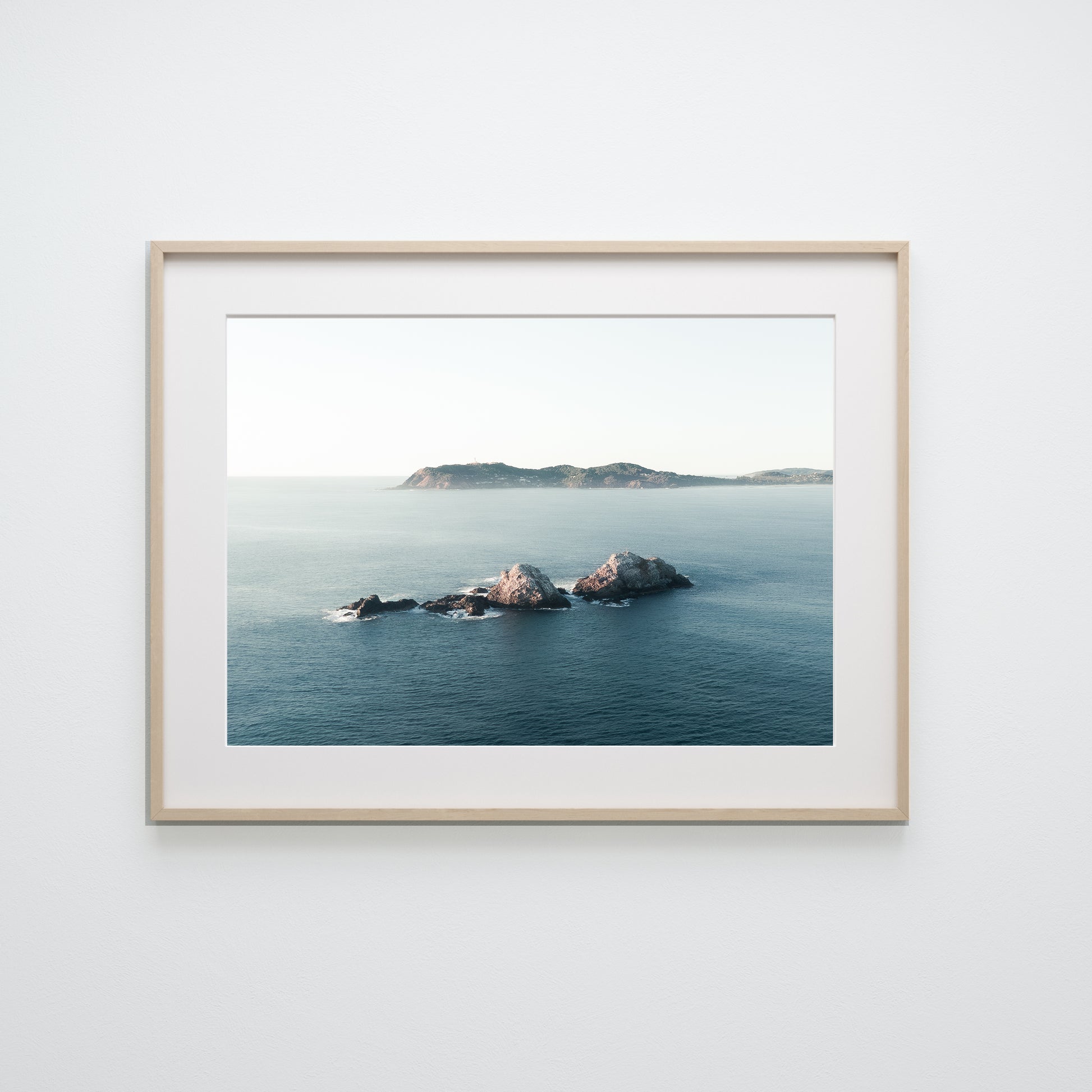 "From a drone's unique vantage point, the iconic Julian Rocks of Byron Bay come to life. Framed against the expansive backdrop of the bay, these rocks stand as timeless sentinels. Their rugged profiles contrast with the tranquil waters of Byron Bay beyond. The interplay of light and shadow, captured in premium detail, unveils the intricate textures of the rocks and the serene beauty of the bay's shimmering expanse."