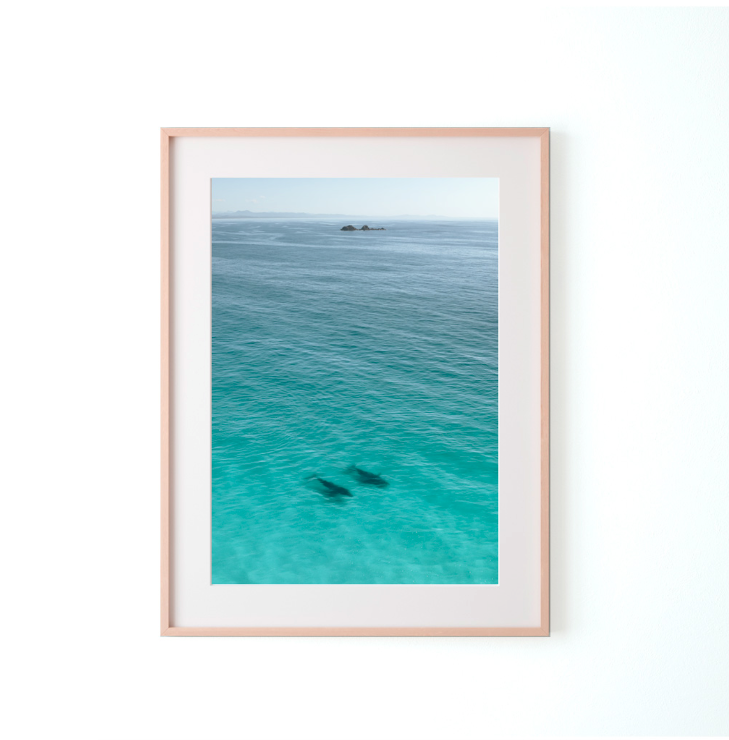 "An awe-inspiring view of Julian Rocks, surrounded by the vibrant turquoise waters of Byron Bay, with whales breaching nearby. The rocky outcrop, teeming with lush greenery and rugged textures, serves as the focal point, while the whales’ majestic forms create dramatic splashes in the surrounding sea. Gentle waves ripple across the water, their movement catching the sunlight, which glints off the ocean’s surface. This stunning composition captures the harmony between the iconic Julian Rocks and the magnificent marine life in their natural habitat."
