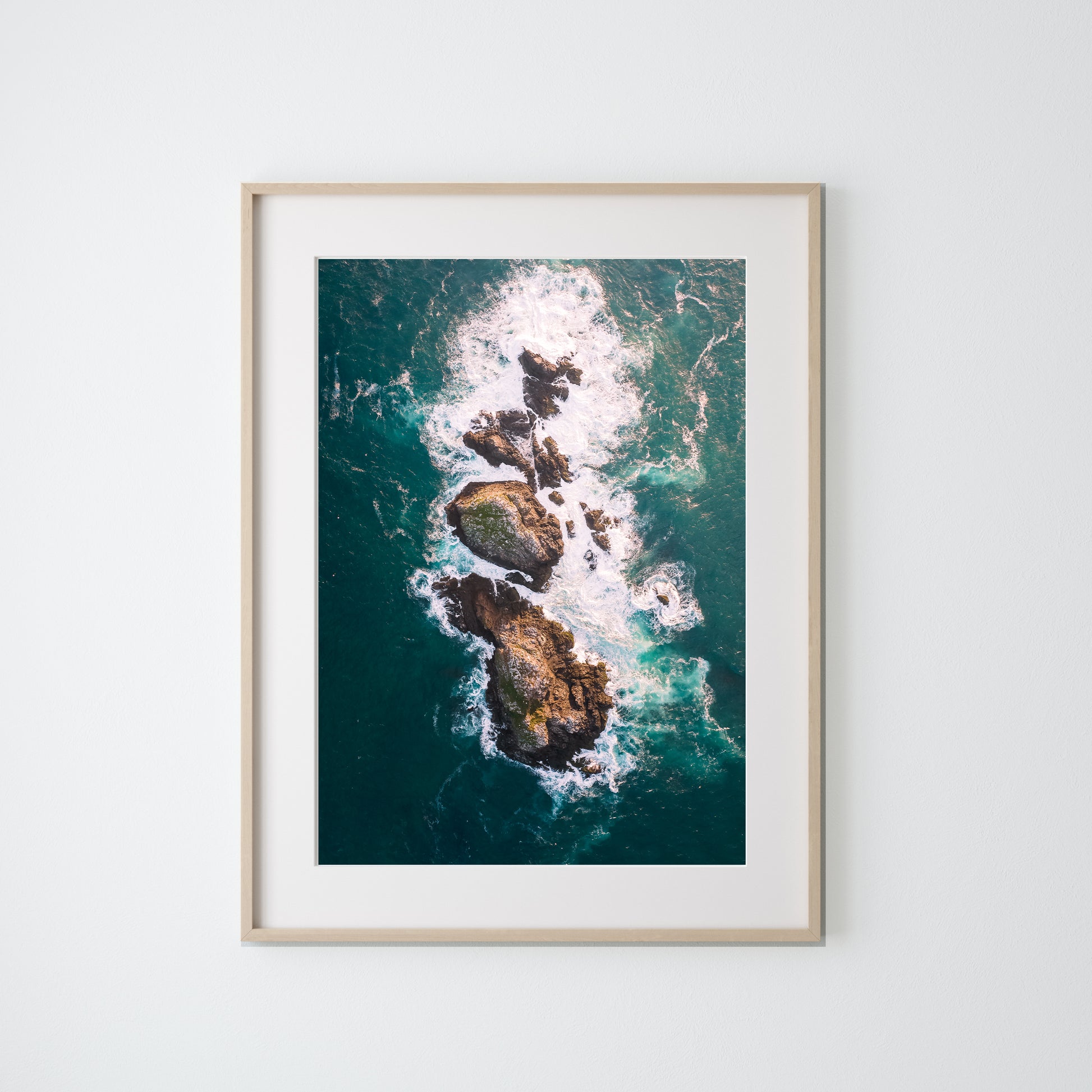 "From a drone's perspective directly above, Julian Rocks emerge as a testament to nature's grandeur. The dramatic tableau showcases the stark contrast between the jagged edges of the rocks and the deep azure abyss of the surrounding waters. Shadows weave a narrative, deepening crevices and elevating the terrain into towering peaks. Captured in premium detail, this image is a raw portrayal of nature's majesty in Byron Bay, where Julian Rocks stand as enduring markers of time's passage."