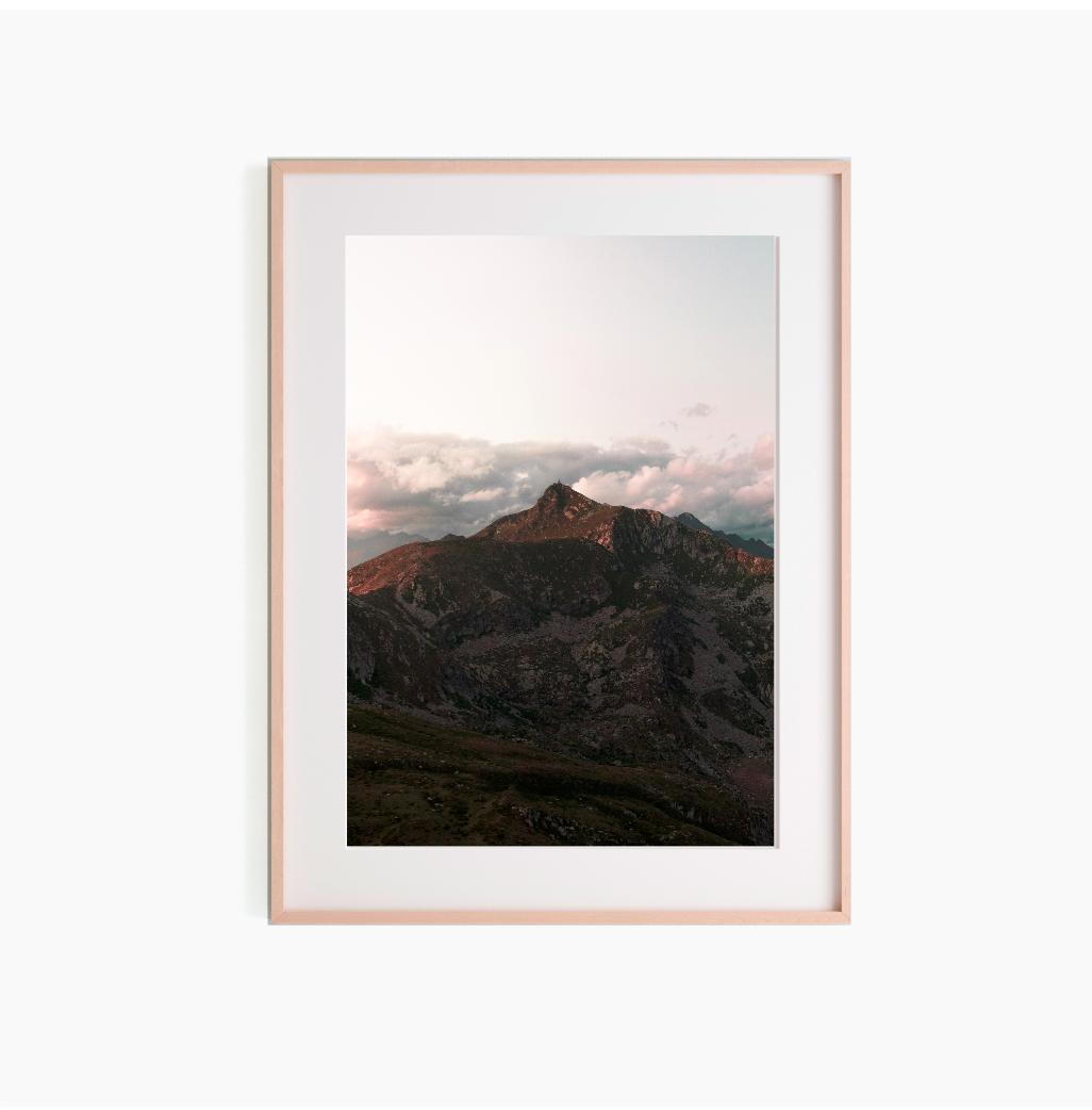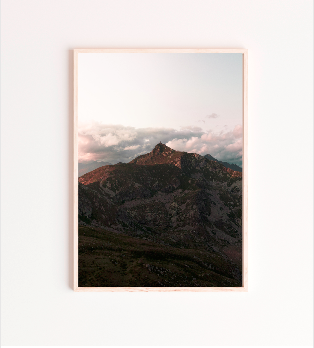 "Behold the breathtaking majesty of Mombarone Peak at sunset, captured in this stunning aerial shot. Bathed in the warm, pink hues of the setting sun, the rugged summit stands as a beacon of tranquility and strength, overlooking the rolling hills and valleys of Piemonte. This premium print celebrates the awe-inspiring beauty of nature’s transitions, offering a vivid portrayal of the harmony between towering landscapes and the soft embrace of twilight. Perfect for those who cherish the serene grandeur of mountain vistas."