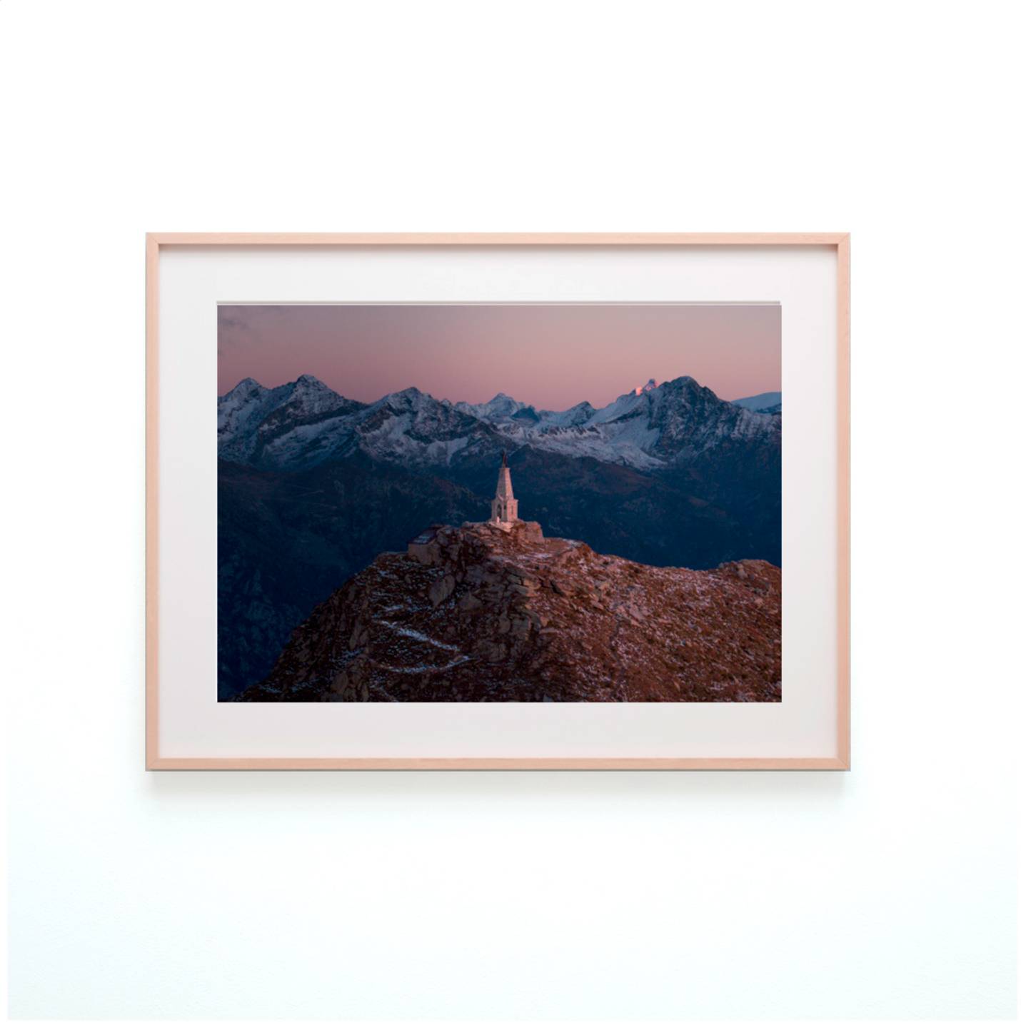 "Experience the awe-inspiring beauty of dawn from the summit of Mombarone, where the iconic statue stands proudly illuminated by the golden hues of sunrise. In the background, the majestic peaks of Valle d'Aosta rise in a breathtaking display, their rugged silhouettes bathed in the soft morning light. This premium print captures the serene majesty of the mountains and the spirit of adventure, offering a timeless perspective of one of Piemonte's most remarkable vantage points."