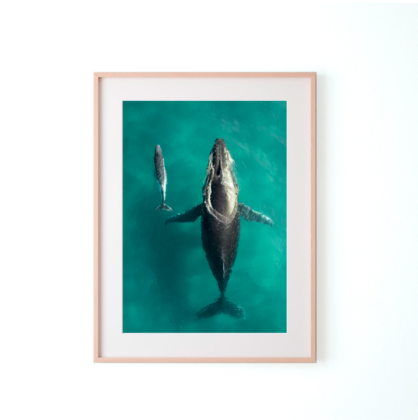 "A heartwarming aerial view of a mother whale and her calf migrating south through the calm, turquoise waters. The mother’s massive, dark form glides protectively alongside her smaller calf, their graceful movements creating gentle ripples that radiate outward. The sunlit water reveals the intricate details of their sleek bodies, emphasizing the tender bond between them. This serene and captivating scene showcases the beauty of marine life and the majestic journey of these ocean giants."