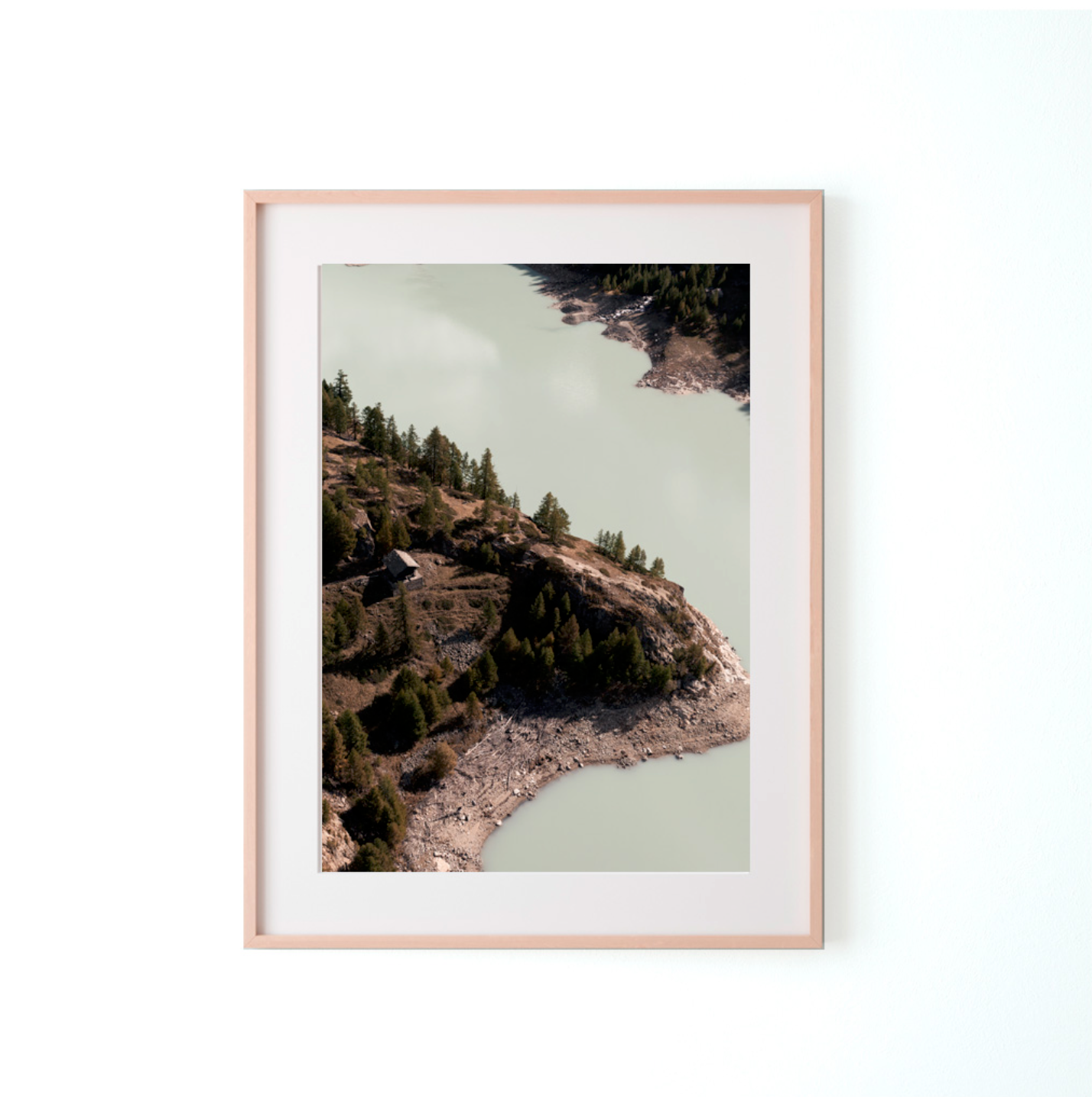 "Discover the serene charm of a solitary house nestled on the lakeside of Place Moulin. Framed by the still turquoise waters and surrounded by the breathtaking alpine landscape, this little house exudes a sense of tranquility and seclusion. This premium print captures the perfect harmony between human simplicity and nature's grandeur, offering a timeless perspective of peace and solitude in the heart of Valle d'Aosta."