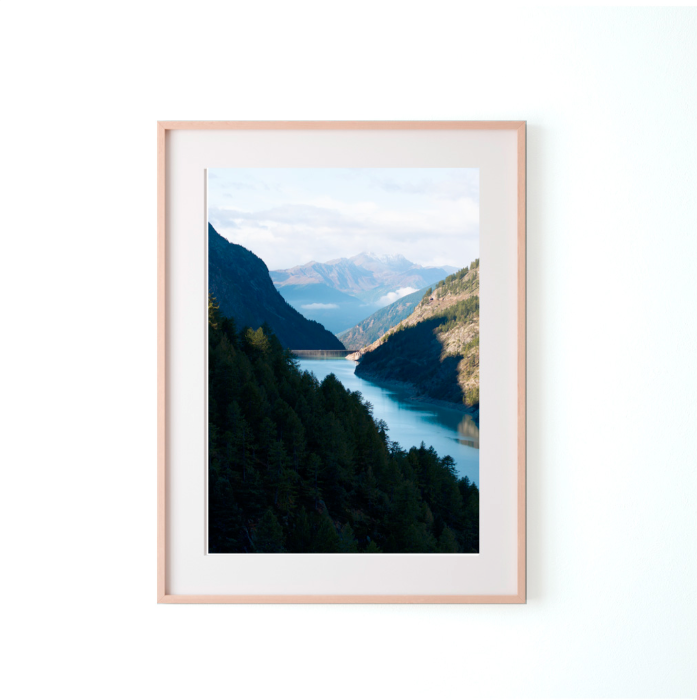 "Discover the striking beauty of the dam at Place Moulin in Valle d'Aosta, nestled gracefully among towering mountain peaks. This awe-inspiring shot captures the turquoise waters held by the dam, contrasting with the rugged stone walls and dramatic alpine backdrop. Surrounded by untouched wilderness, this premium print offers a stunning perspective of human ingenuity harmonizing with nature's grandeur, perfect for those who appreciate the captivating allure of high-altitude landscapes."