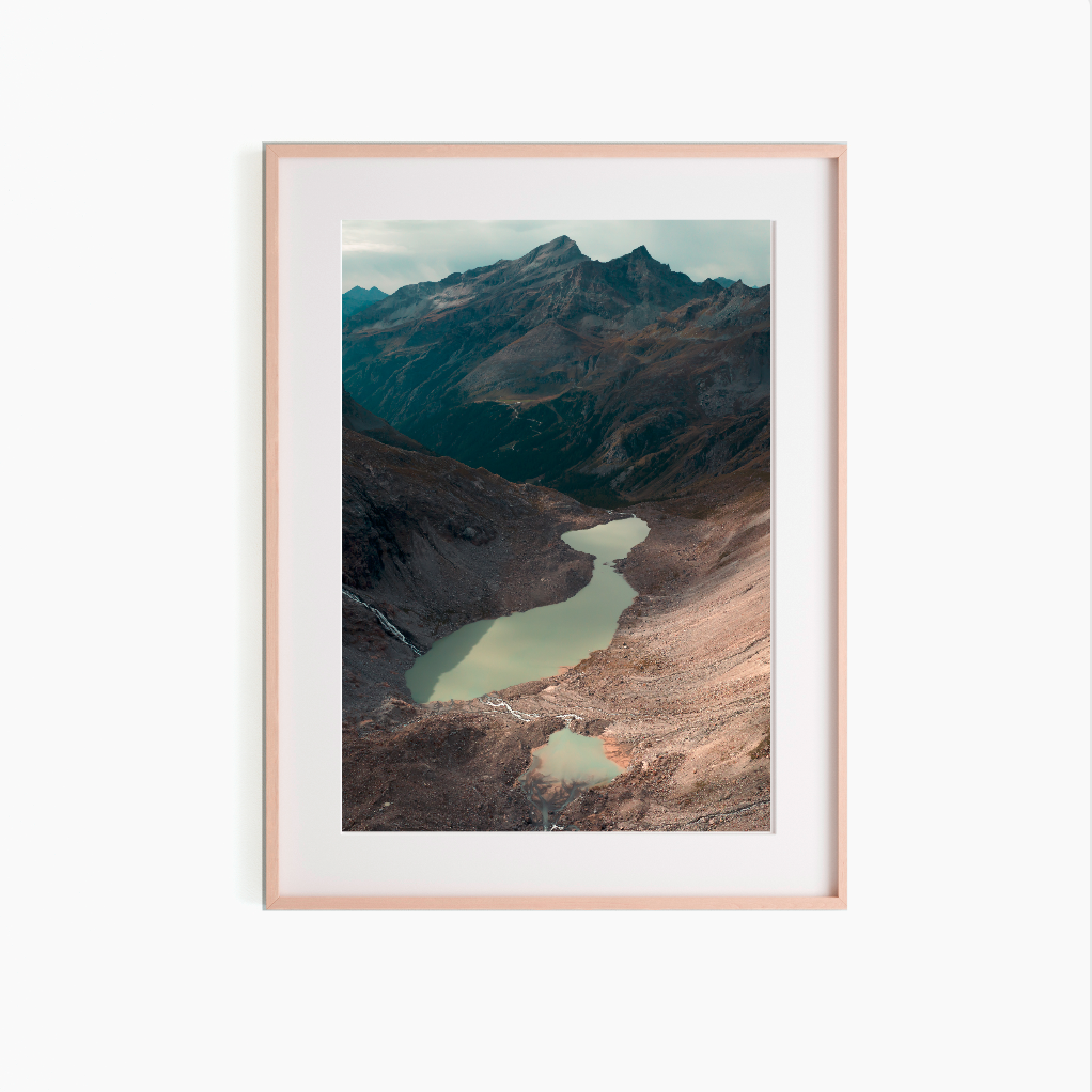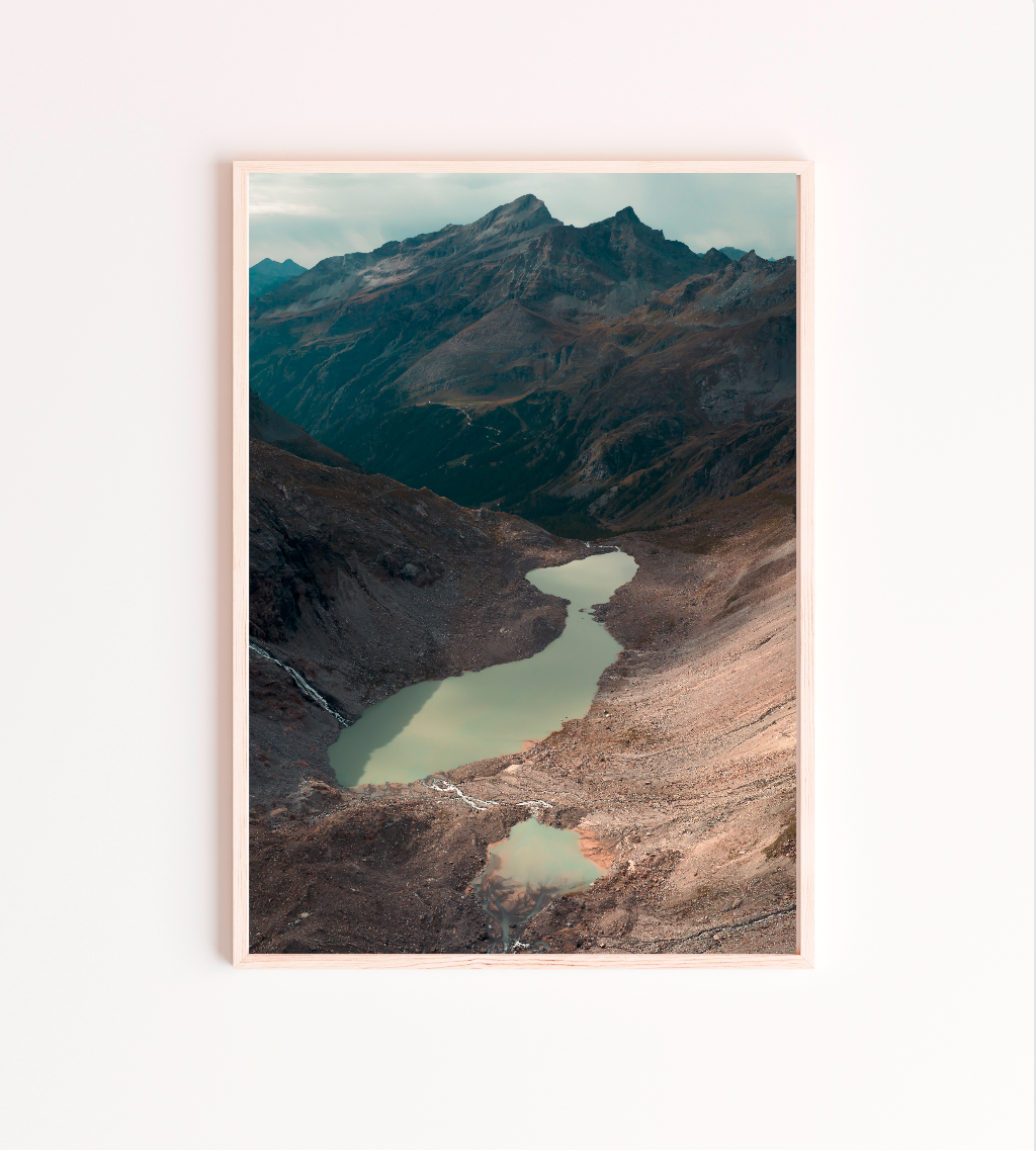 "Immerse yourself in the pristine beauty of the Sorgente del Lys in Gressoney with this captivating shot, looking down at the expansive valley below. The source of the Lys River glistens amidst a rugged alpine setting, framed by majestic peaks and verdant slopes. This premium print captures the essence of untouched wilderness and the grandeur of the Valle d'Aosta, offering a breathtaking perspective that celebrates the harmony between water, mountains, and the sweeping vistas of the valley."