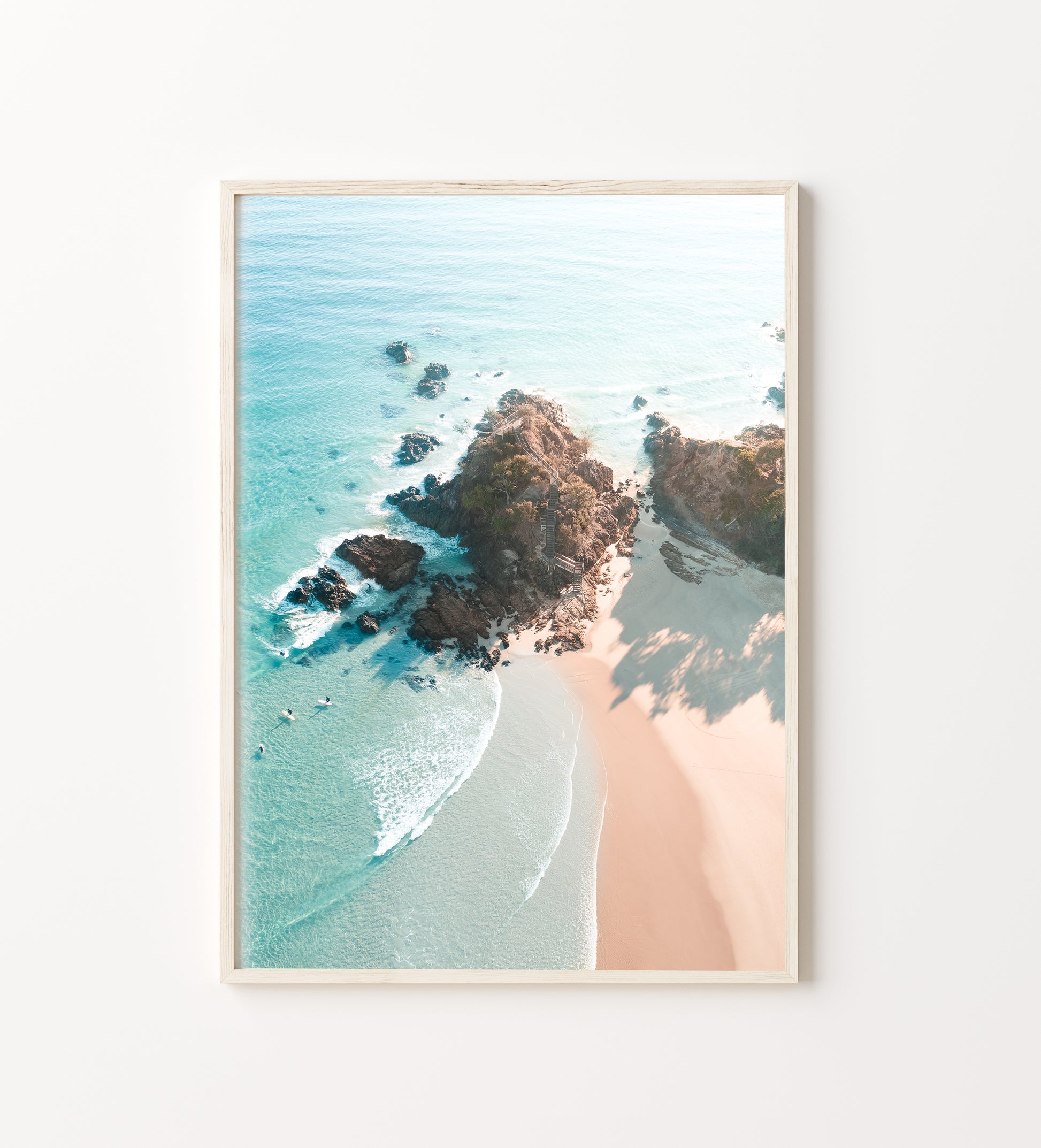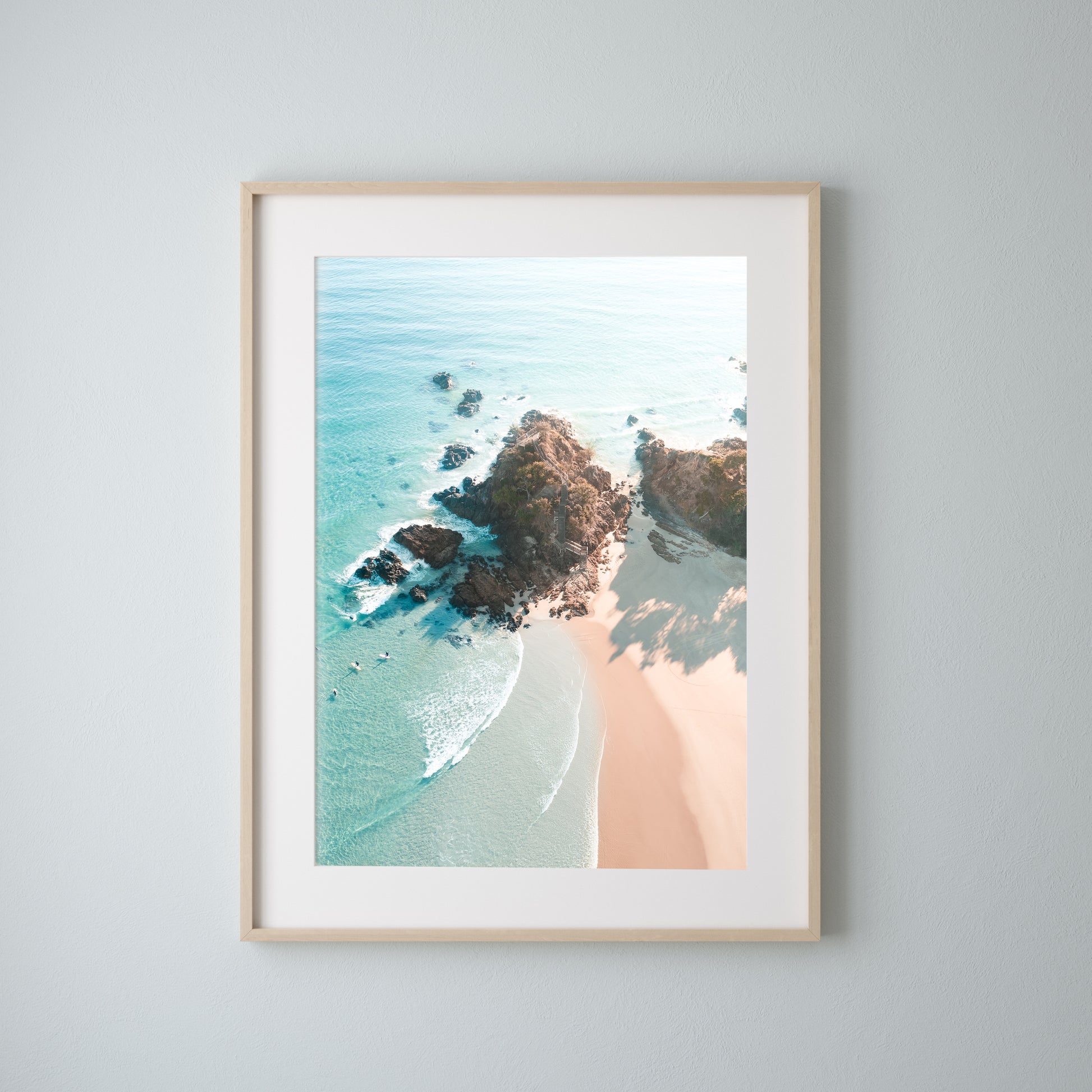 "Through the lens of aerial drone photography, amidst the iconic backdrop of 'The Pass', surfers gracefully navigate the waves. Their silhouettes, in harmony with the ocean's rhythm, craft a vibrant tableau. This aerial capture showcases the seamless blend of sport and nature, presented in premium detail."