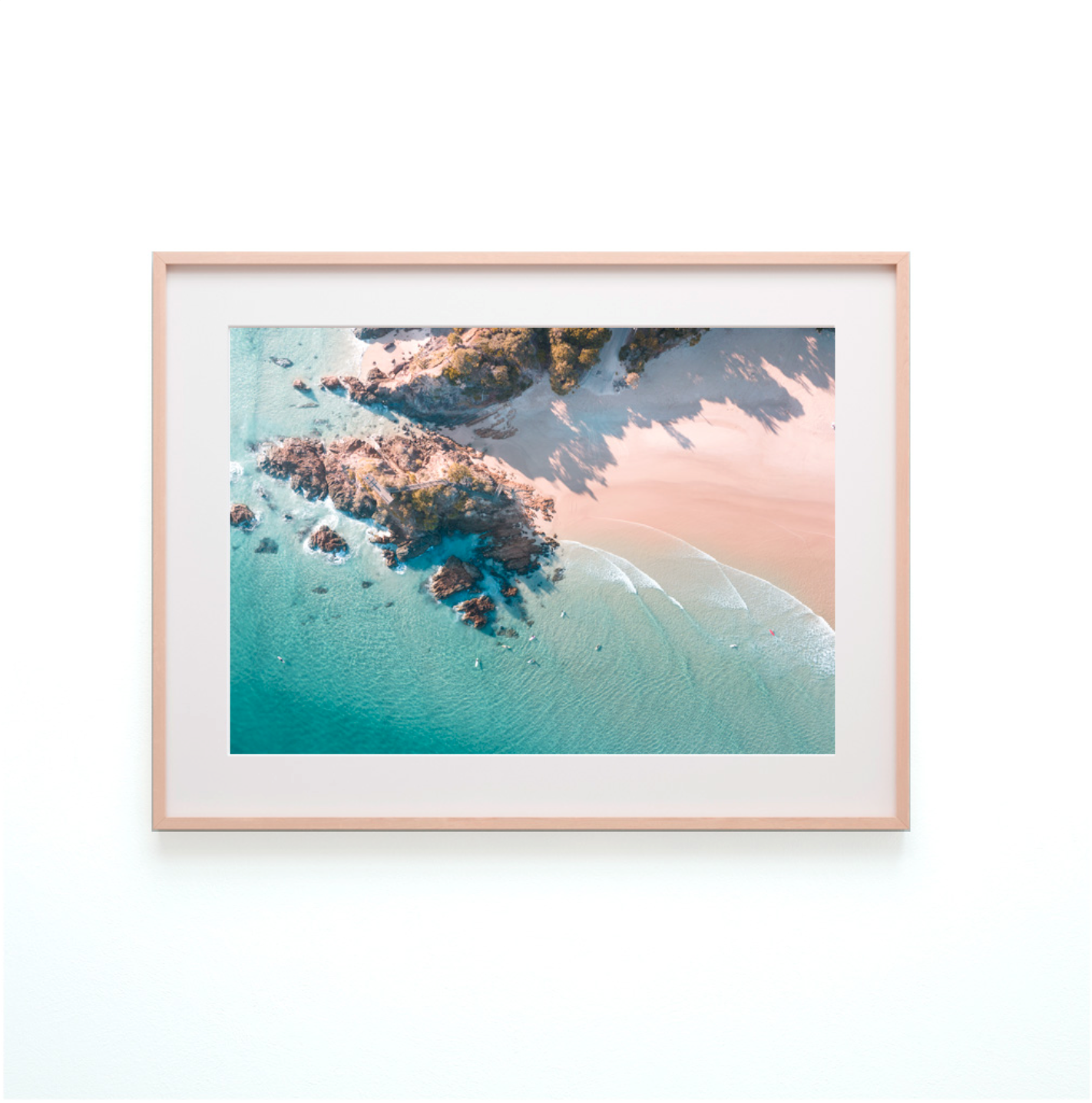 "A captivating top-down view of The Pass in Byron Bay, showcasing its iconic crescent-shaped shoreline. The turquoise water transitions from deep blue to lighter hues as it approaches the golden sandy beach, where surfers and beachgoers dot the landscape. Waves gently roll toward the shore, forming perfect lines that highlight the spot’s renowned surf breaks. The rocky outcrop and walking track leading to the lookout add depth to the scene, framed by the lush greenery of surrounding vegetation. This aerial perspective perfectly captures the dynamic beauty of this iconic destination."