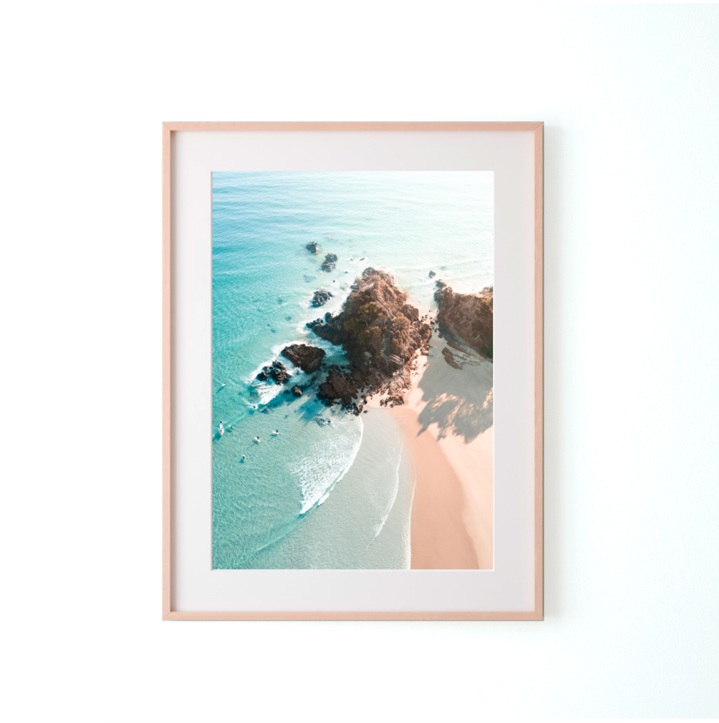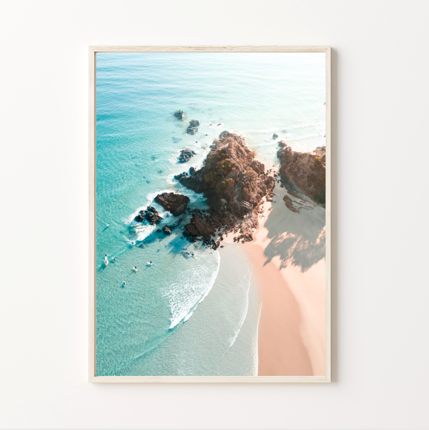 "A captivating top-down view of The Pass in Byron Bay, showcasing its iconic crescent-shaped shoreline. The turquoise water transitions from deep blue to lighter hues as it approaches the golden sandy beach, where surfers and beachgoers dot the landscape. Waves gently roll toward the shore, forming perfect lines that highlight the spot’s renowned surf breaks. The rocky outcrop and walking track leading to the lookout add depth to the scene, framed by the lush greenery of surrounding vegetation. This aerial perspective perfectly captures the dynamic beauty of this iconic destination."