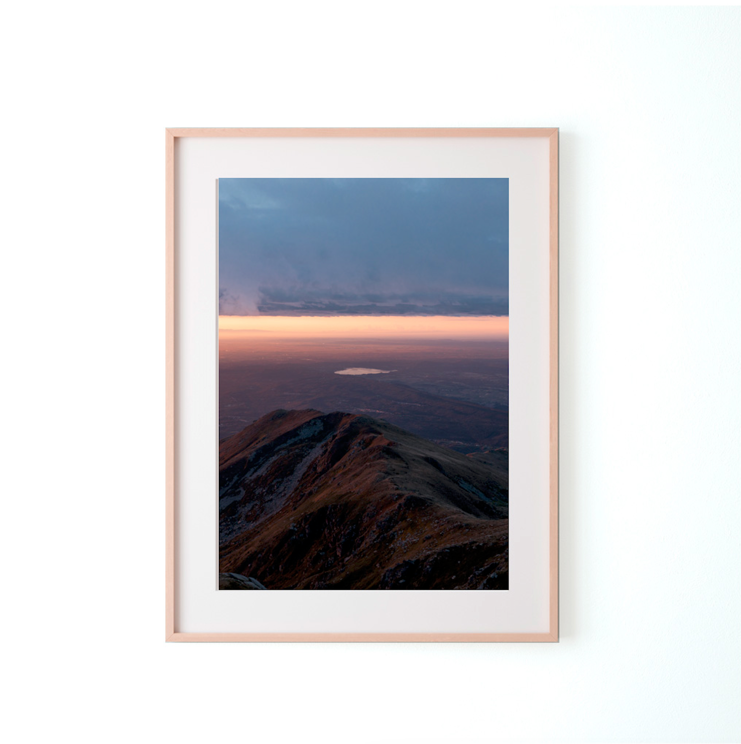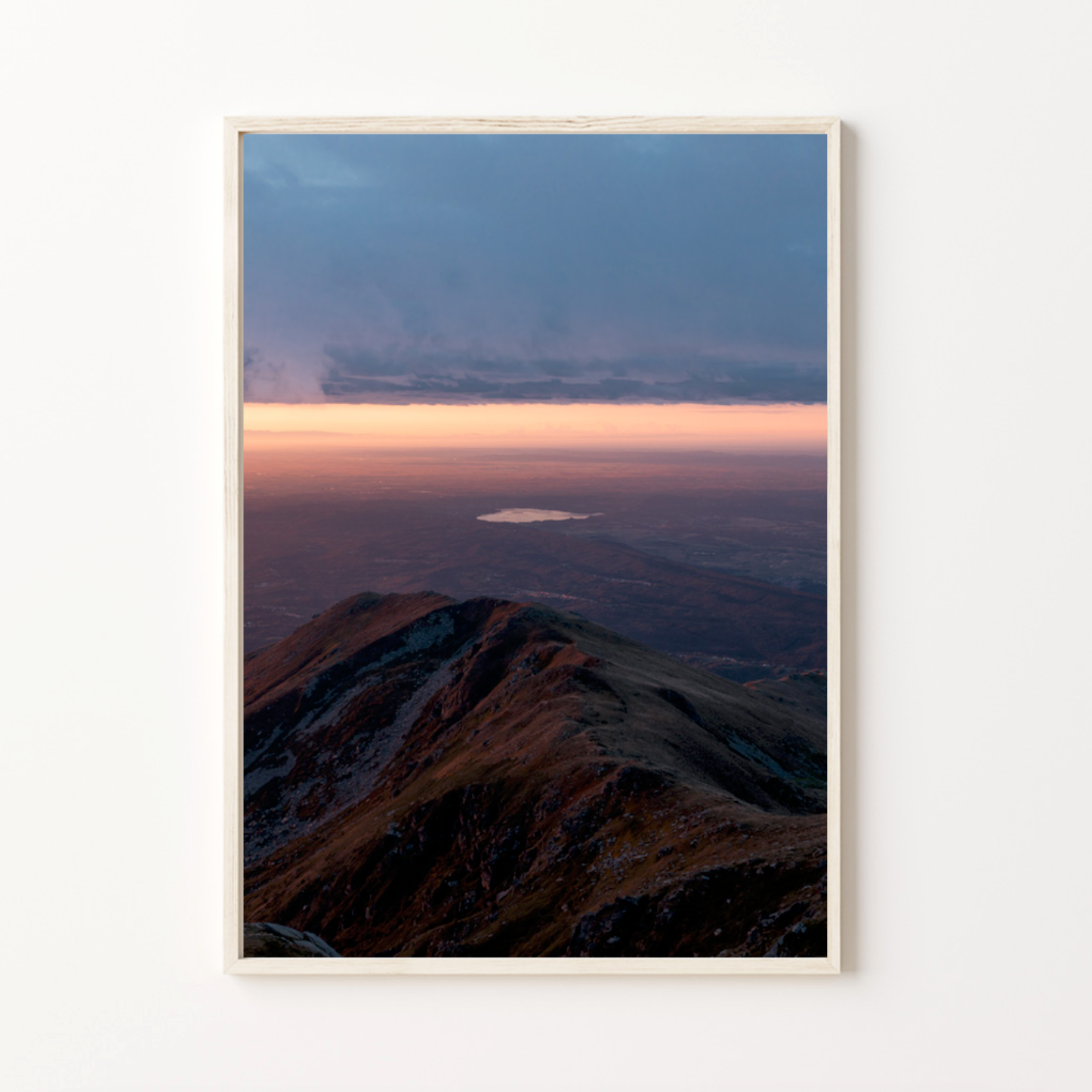 "Immerse yourself in the breathtaking view from the slopes of Mombarone Mountain, overlooking the iconic Serra formation and the shimmering Viverone Lake. This stunning shot captures the sweeping expanse of the landscape, where the ridges of the Serra gracefully lead the eye to the tranquil waters of the lake. Bathed in soft, natural light, this premium print celebrates the harmony of rugged alpine terrain and serene valleys, offering a unique perspective of Piemonte's captivating beauty."