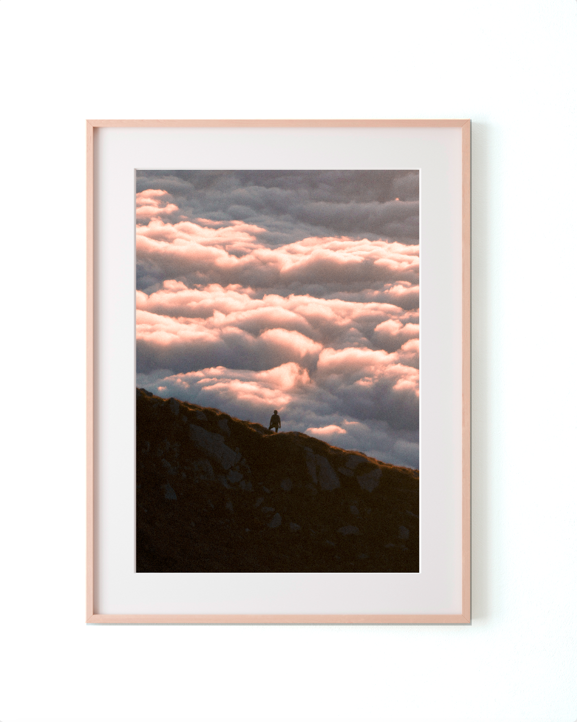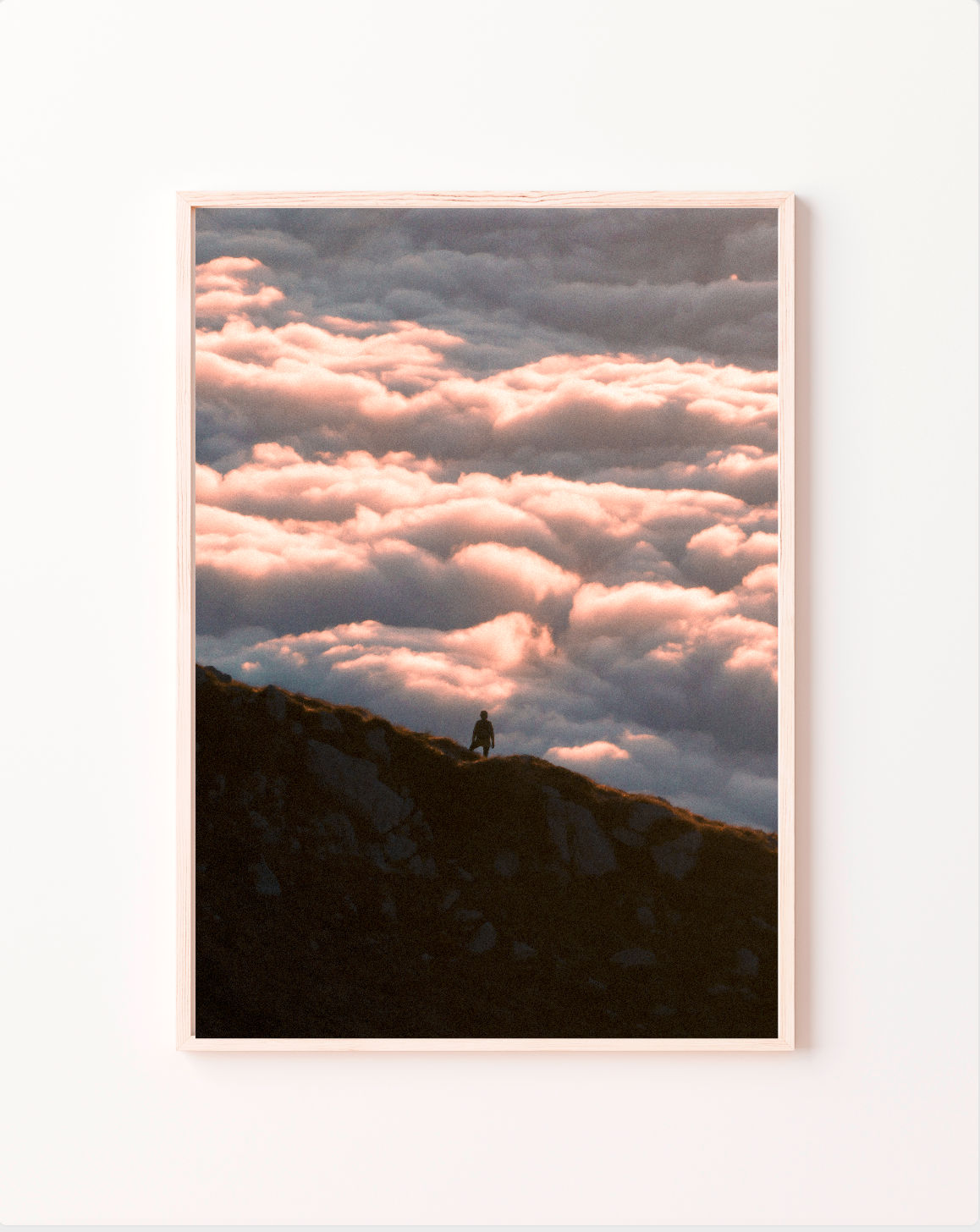 "Rise above the world with this ethereal shot taken from a mountain peak, where a sea of clouds stretches endlessly below. The sun casts a delicate pink glow across the misty expanse, creating a dreamlike tapestry of soft light and shadow. This premium print captures the serene beauty of dawn from the heights, offering a perspective that evokes a sense of wonder and the limitless majesty of nature."
