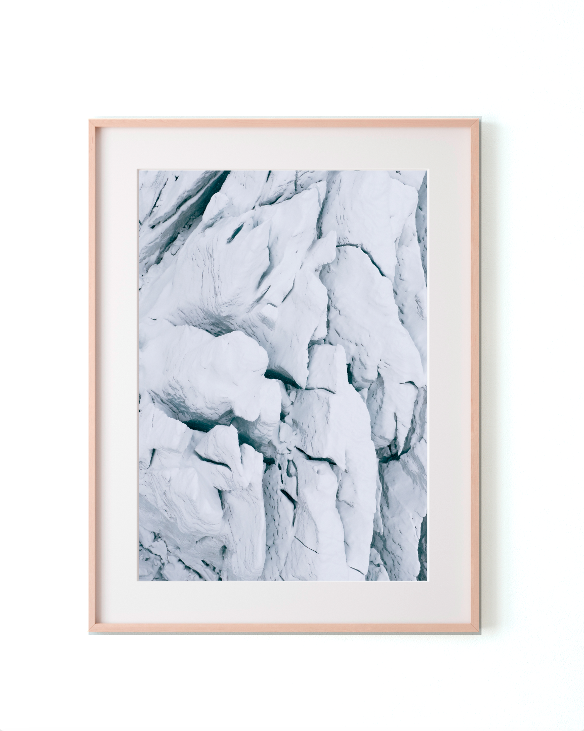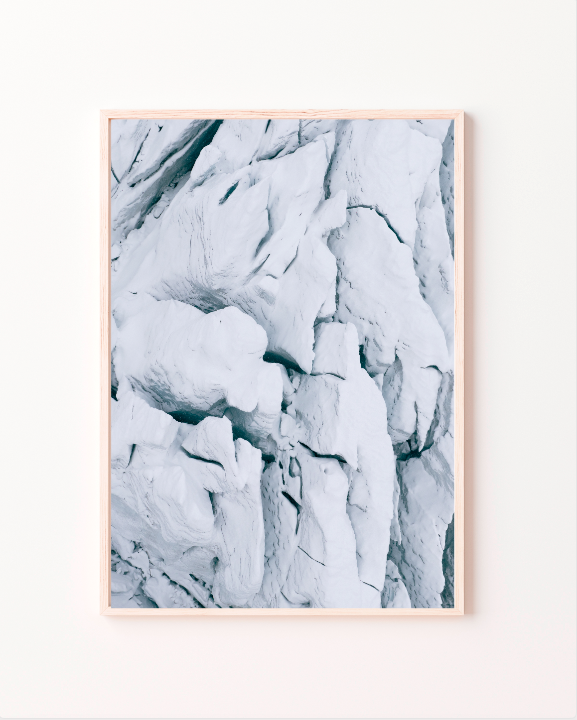 "Immerse yourself in the pristine beauty of winter with this top-down view of a glacier blanketed in snow. The subtle patterns of hidden crevasses peek through the pure white surface, creating a striking contrast of texture and depth. This premium print captures the serene stillness and raw power of a frozen landscape, offering a unique perspective on nature's winter artistry in the heart of the mountains."