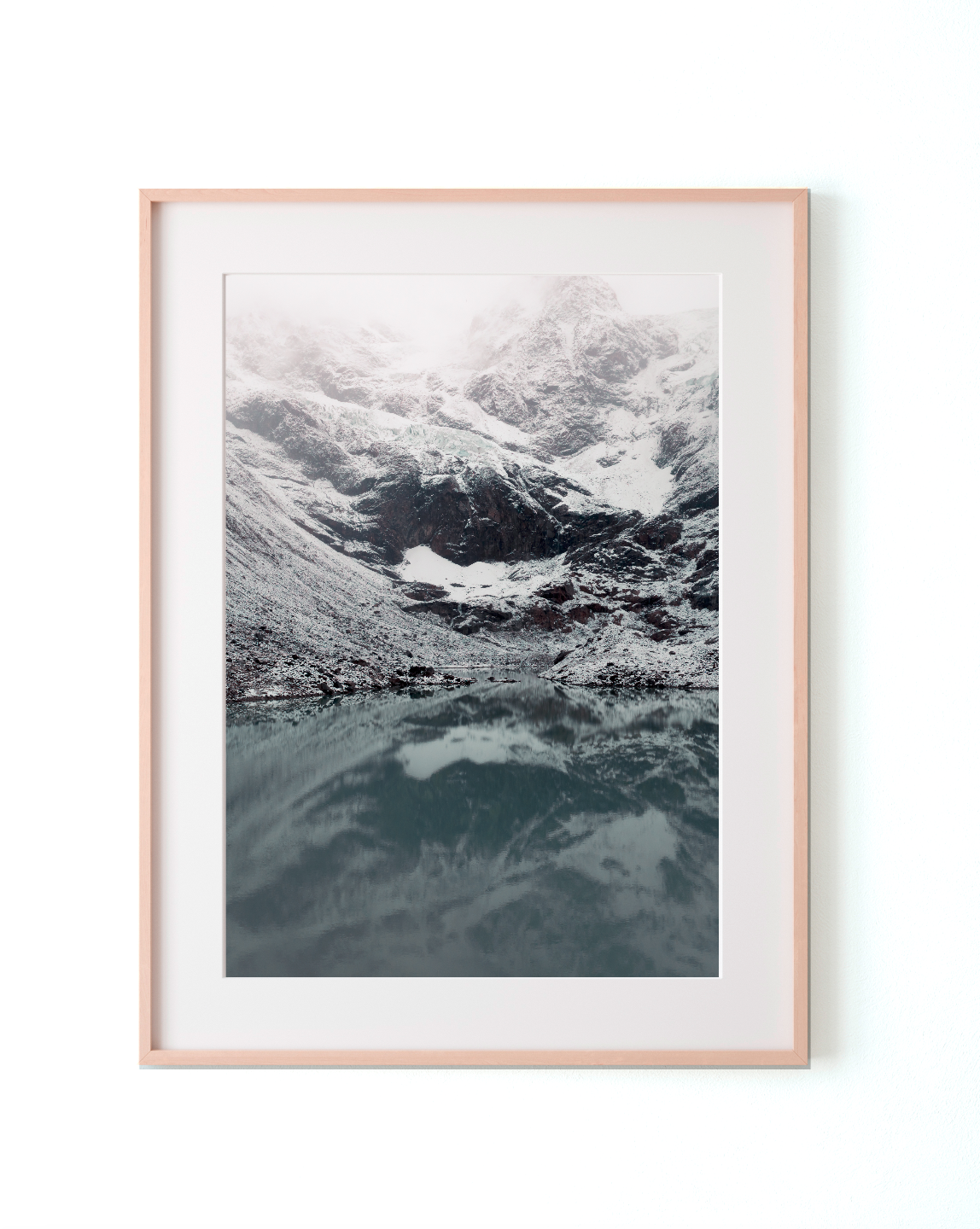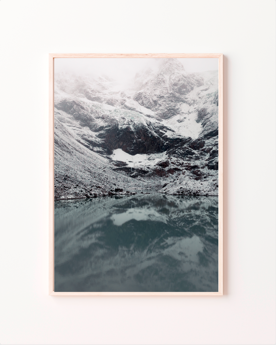 "Experience the magical winter splendor of the Lys Glacier as it cascades down Monte Rosa, shrouded in freshly fallen snow. Captured in the midst of a gentle snowfall, this breathtaking scene reveals the glacier's icy expanse, perfectly mirrored in the serene waters of a nearby alpine lake. The majestic Monte Rosa peaks loom above, their grandeur reflected in the tranquil surface below. This premium print celebrates the enchanting harmony of snow, ice, and reflection, offering a serene and powerful perspective of the Alps in their winter glory."